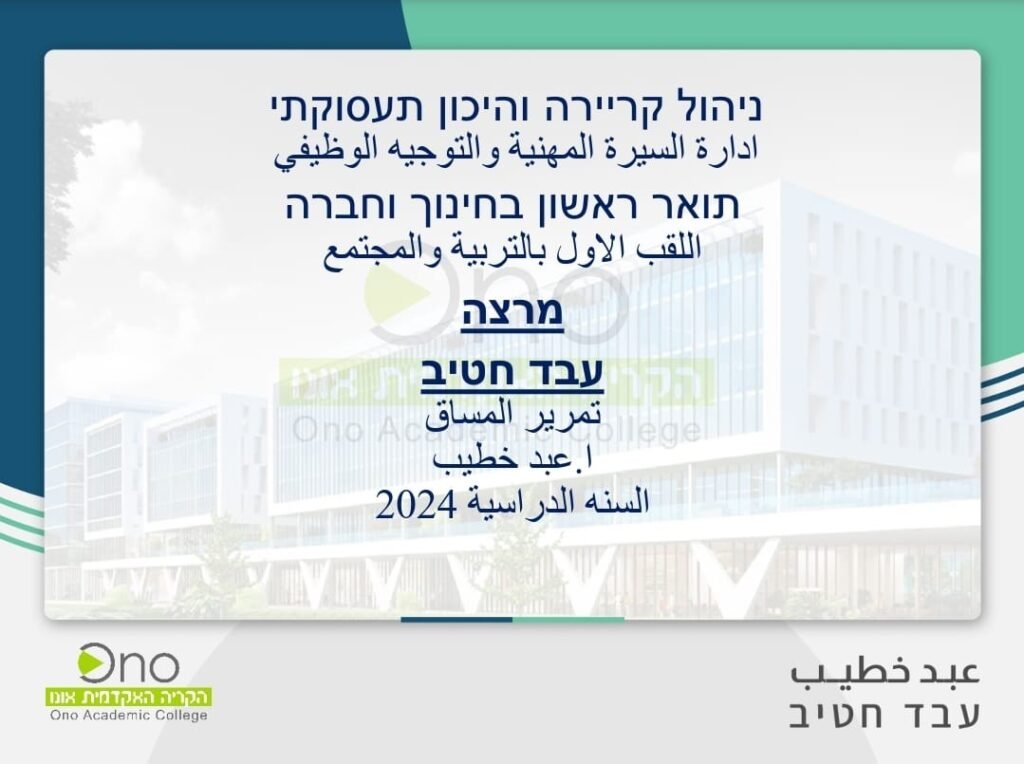 ב-11 ביוני 2024 התקיימה ההרצאה האחרונה בקורס "ניהול קריירה והכוונה תעסוקתית" , אשר הועברה לסטודנטים לתואר ראשון בחינוך וחברה, בשנה השלישית ללימודיהם בקמפוס ירושלים של הקריה האקדמית אונו.